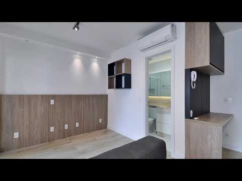 Este Studio com 33m2 foi ricamente decorado. Possui painel em marcenaria para acomodar cama box, armários embutidos espelhados, bancada de trabalho, painel para TV com rack, sofá e ar-condicionado. Banheiro moderno com armários. Copa/cozinha com refrigerador, escorredor de louças embutido e bancada para refeições com vários armários, comporta fogão de indução. Varanda envidraçada e 1 vaga de garagem. Andar alto com vista livre.